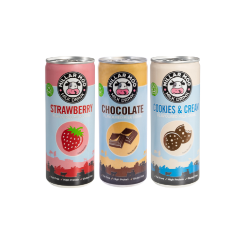 Check out our brand new Millar Moo Flavoured Milk Cans! The perfect grab and go refreshment, available in crowd pleasing Strawberry and all new Cookies & Cream flavours.